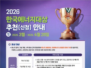 한국에너지공단(이사장 최재관, 이하공단)은 4월 28일(화)까지 ‘2026년 한국에너지대상’ 유공자 포상에 대한 추천(신청)을 받는다.올해로 48회를 맞는 한...